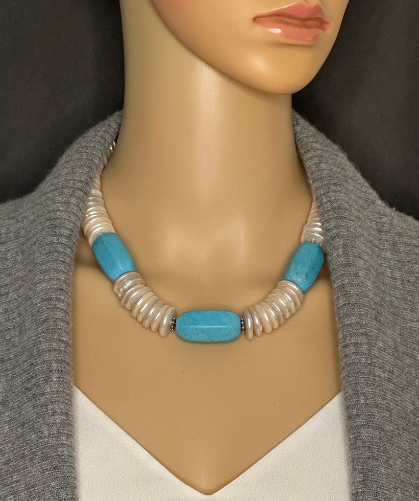 Beads: freshwater coin pearls, Afghan faience beads, sterling silver